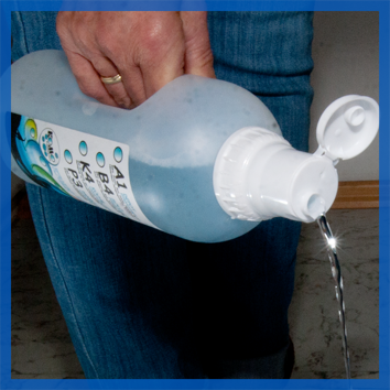 Griffflasche für Reinigerkonzentrat. Befüllung aus Kanister. Zur Portionierung in Kübel oder für die Zubereitung einer gebrauchsfertigen Lösung in der Mehrwegflasche.